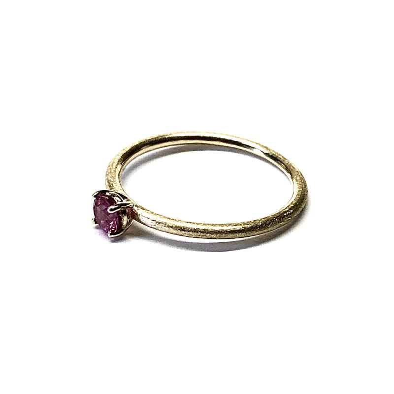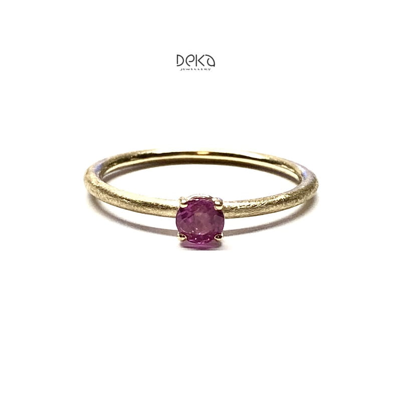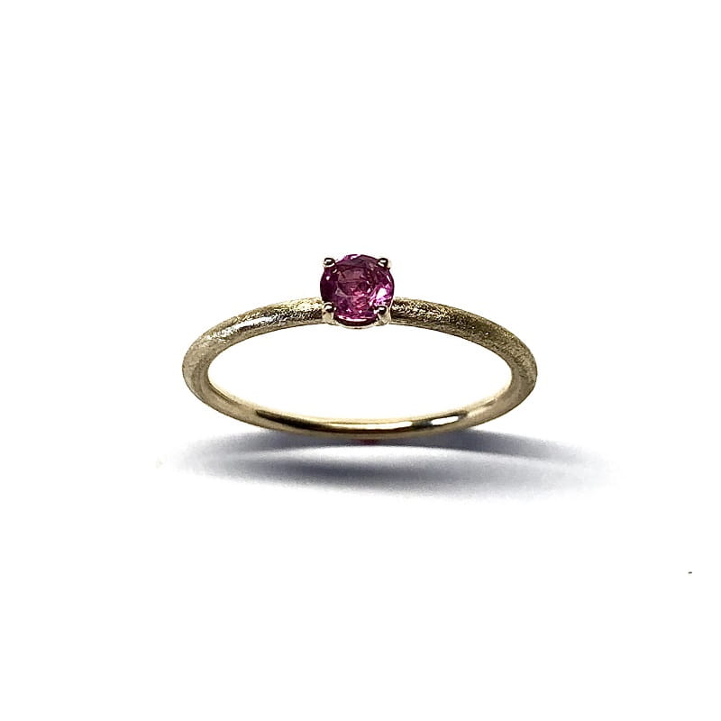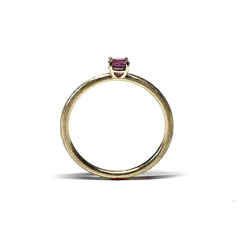 Delikatny pierścionek wykonany z żółtego lub białego złota. Subtelny, minimalistyczny design,utrzymany w romantycznym stylu z naturalnym rubinem. Obrączka pierścionka wykonana z okrągłego profilu o średnicy 1,5mm. Pierścionek jest wykonywany na zamówienie w wybranym rozmiarze.