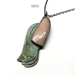 Naszyjnik z dużym różowym opalem wykonany ręcznie ze srebra oksydowanego, miedzi pokrytej zieloną patyną i złotych granulek. Wymiary zawieszki ok 6x2cm , długość łańcuszka 70cm.