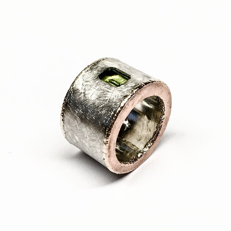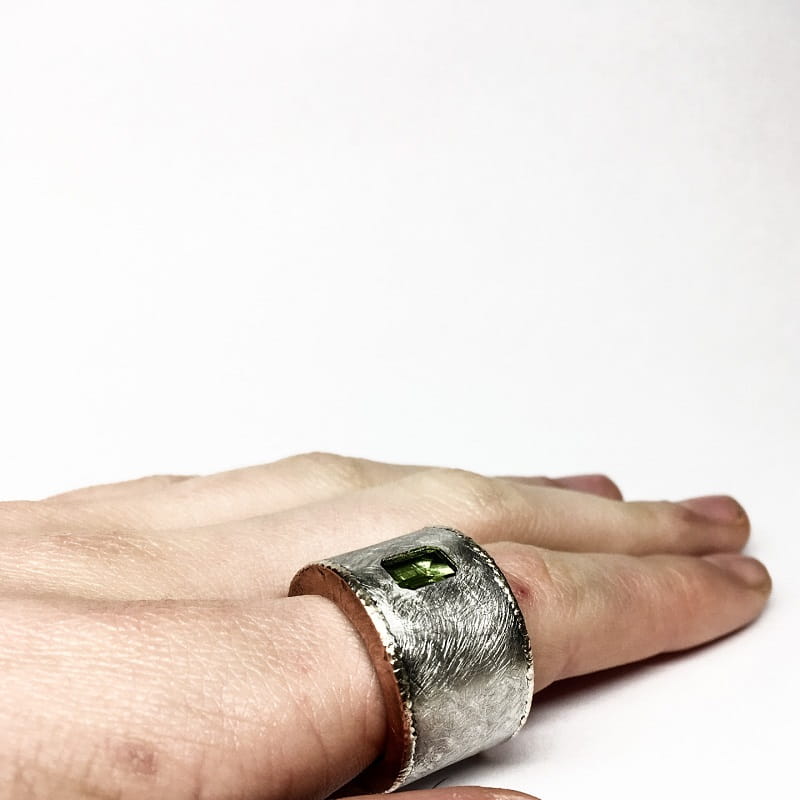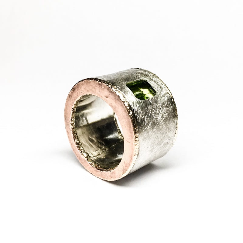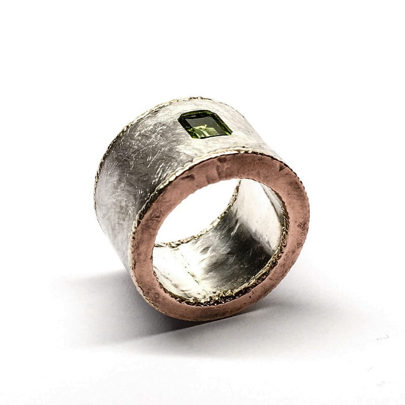 Oryginalna obrączka wykonana ręcznie ze srebra i miedzi. Prosta, masywna bryła w której zatopiony jest szlachetny kamień. Obrączka jest lekka, biorąc pod uwagę jej formę i gabaryty... Zbudowana jest z zespawanych elementów, na krawędziach widoczne są spawane łączenia. Obrączka ma szerokość 15 mm. Rozmiar pierścionka 14. Istnieje możliwość wykonania takiej obrączki z innym kamieniem i w innym rozmiarze. Czas realizacji zamówienia ok 14dni.