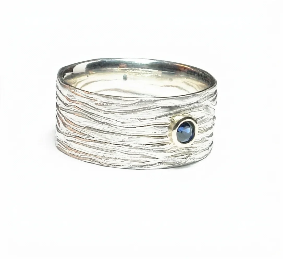 Oryginalna obrączka, wykonywana ze srebra pr 0,925 z szafirem oprawionym w żółte złoto pr 0,585 (14K). Obrączka wykonywana jest na zamówienie.