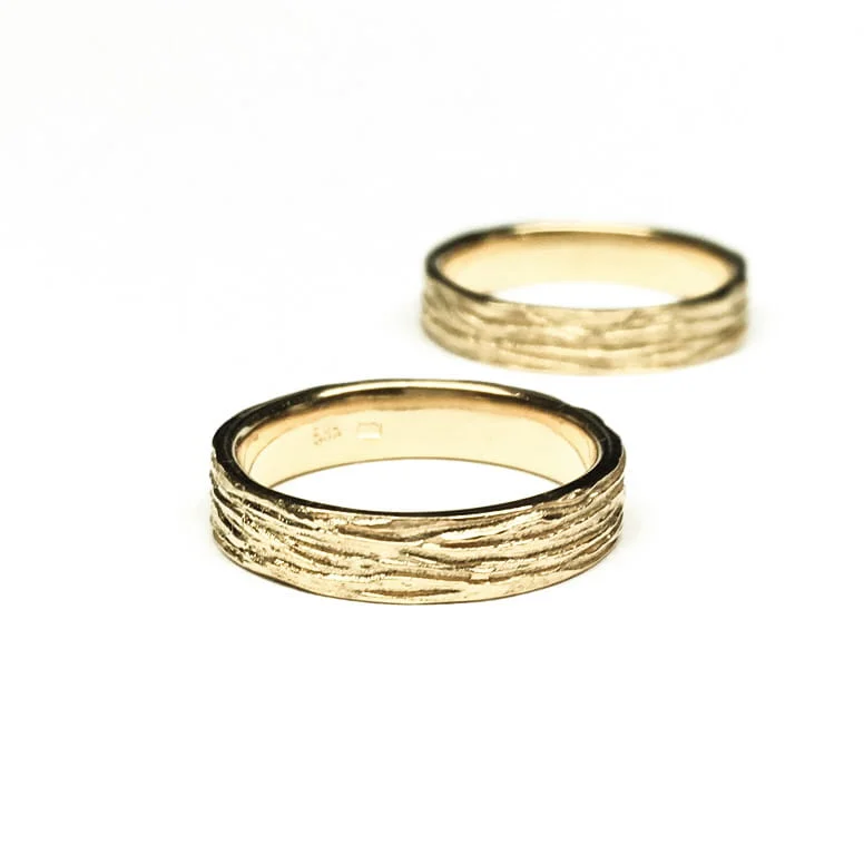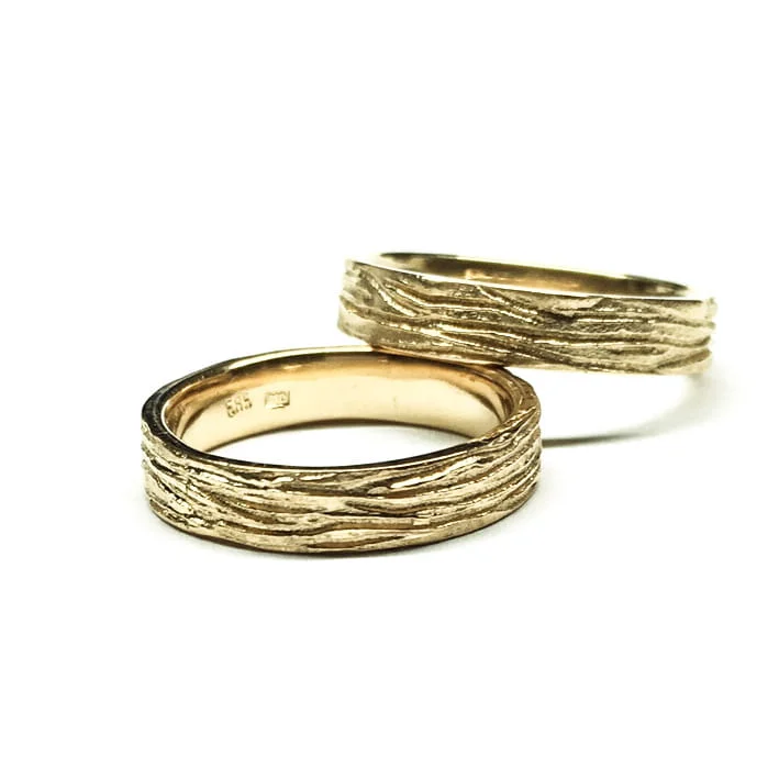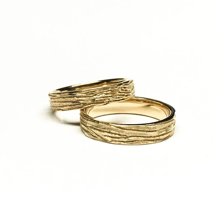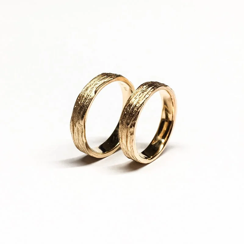 Ślubne obrączki z żółtego, różowego lub białego złota pr 0.585 (14K). Wykonywane ręcznie, na zamówienie po wcześniejszym ustaleniu rozmiarów. Wyrazista faktura na powierzchni obrączek sprawia że każdy egzemplarz jest niepowtarzalny. Szerokość obrączek 4mm . Grubość ok 1,5mm.