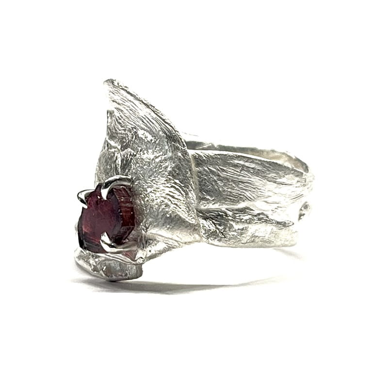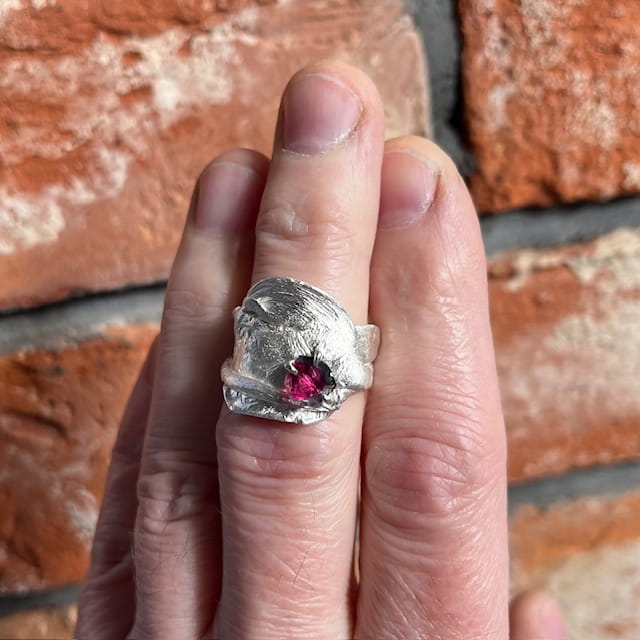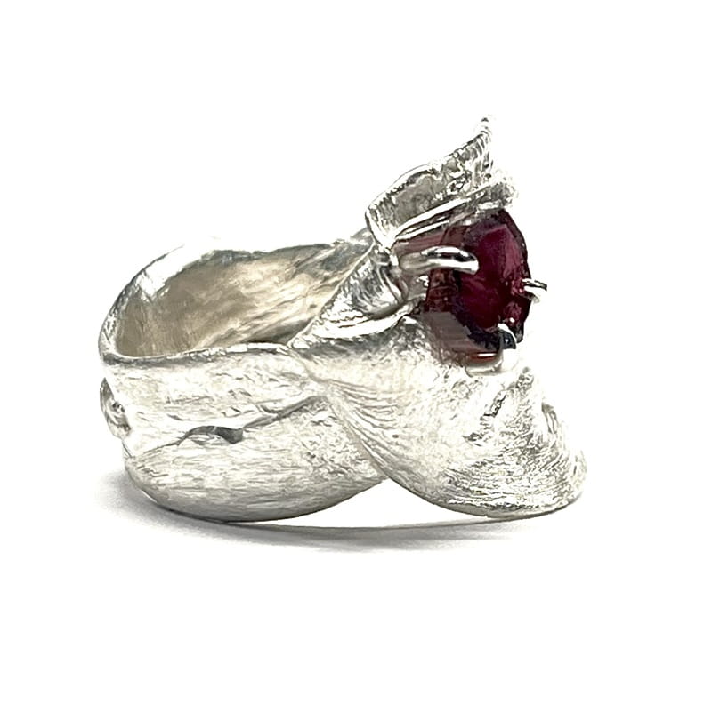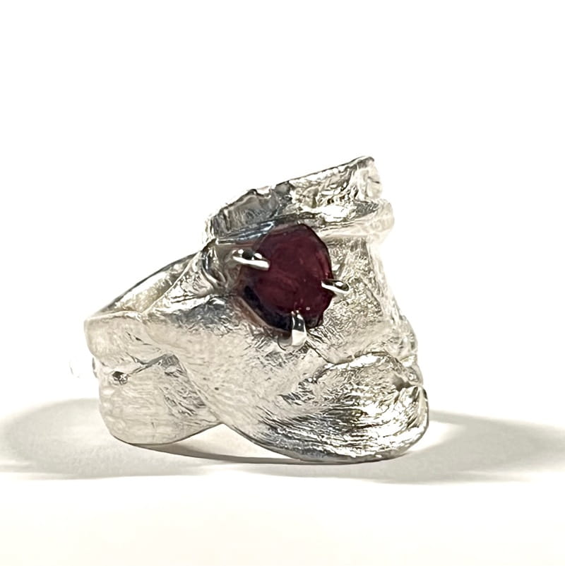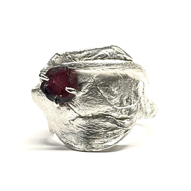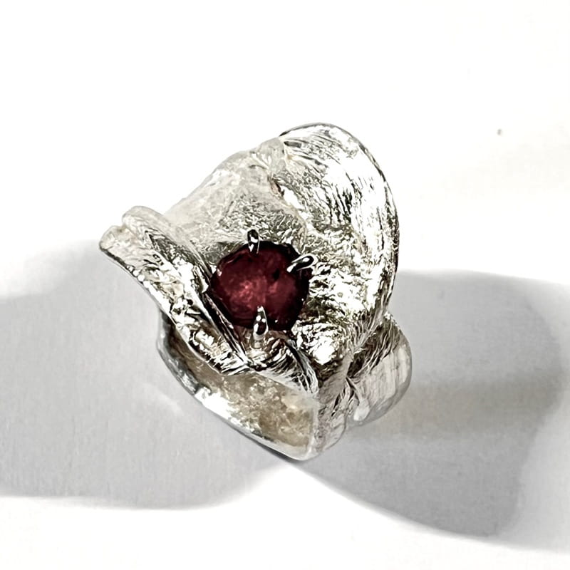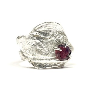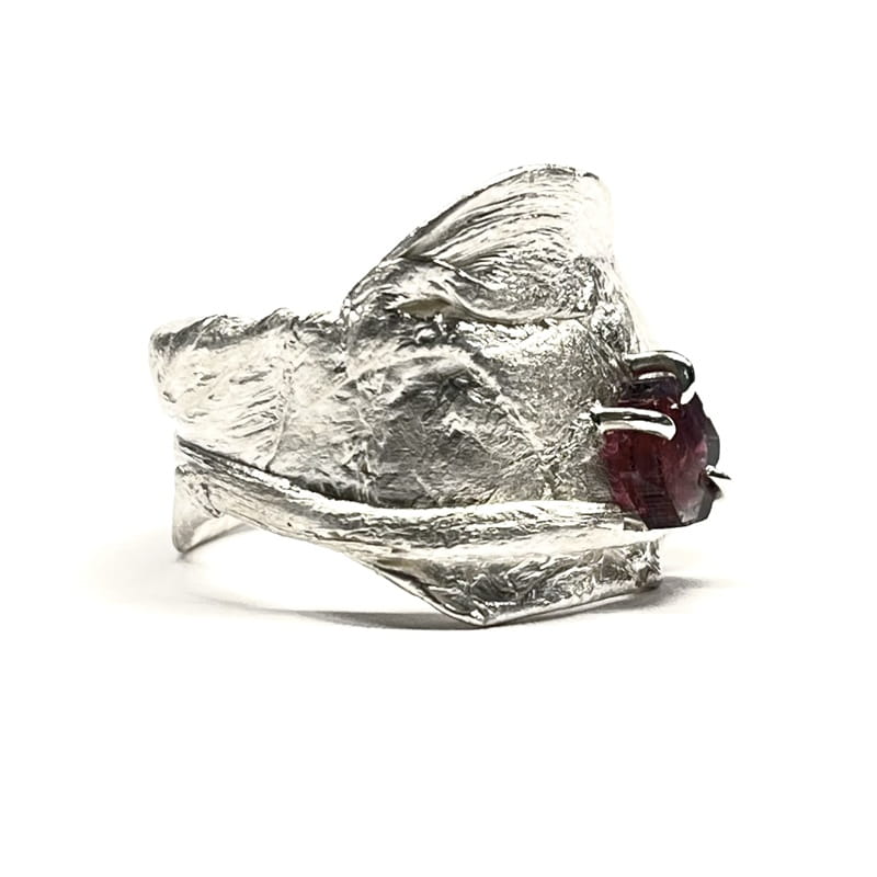 Unikatowy szeroki pierścionek, wykonany ręcznie ze srebra 0,925 z arbuzowym turmalinem. Szerokość pierścionka na górze 20 mm, na dole 8 mm. Rozmiar pierścionka 16/17.
