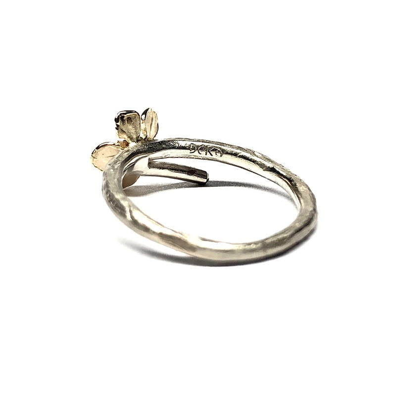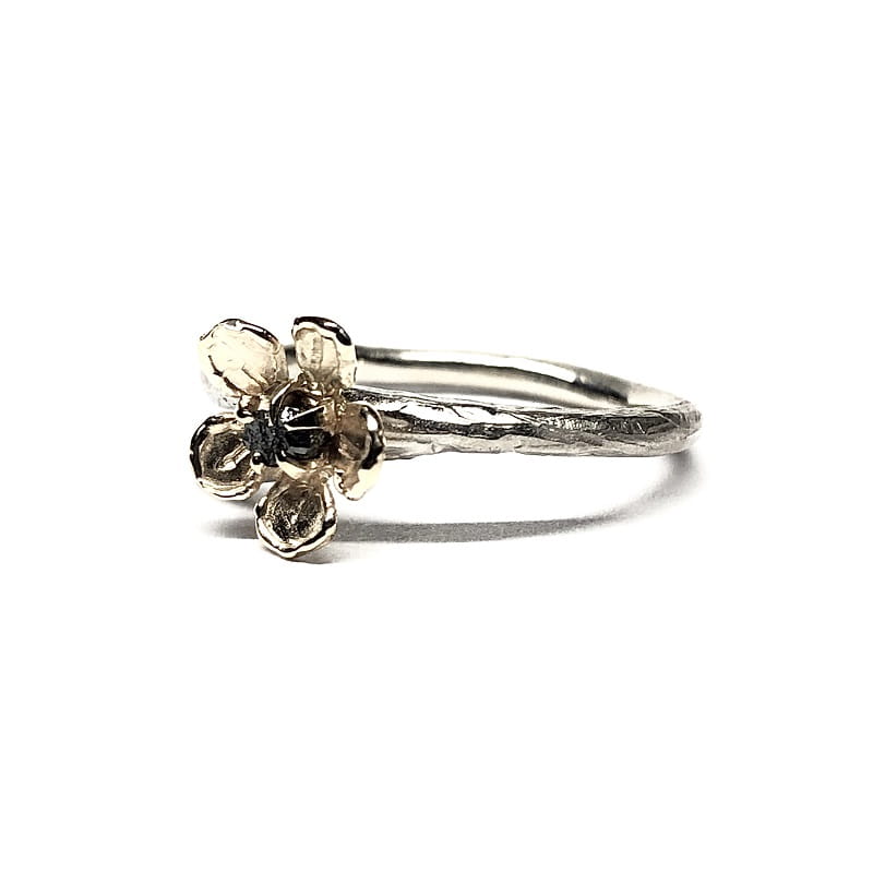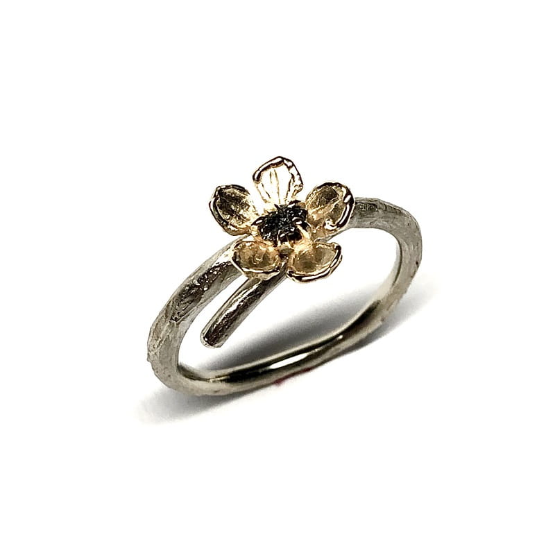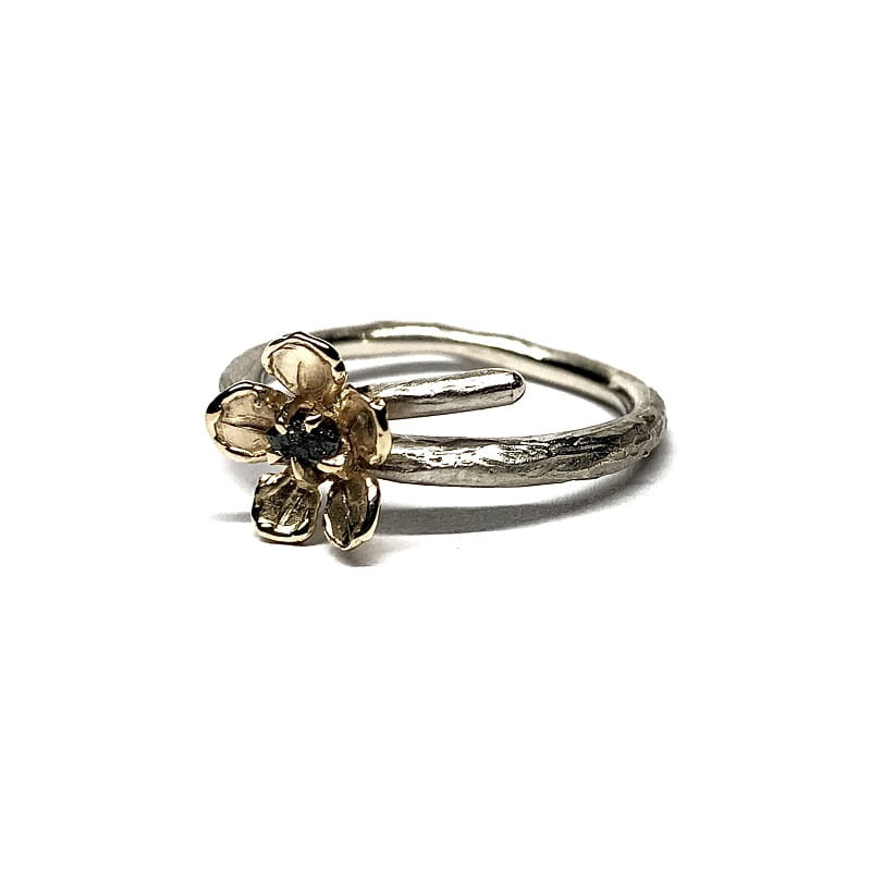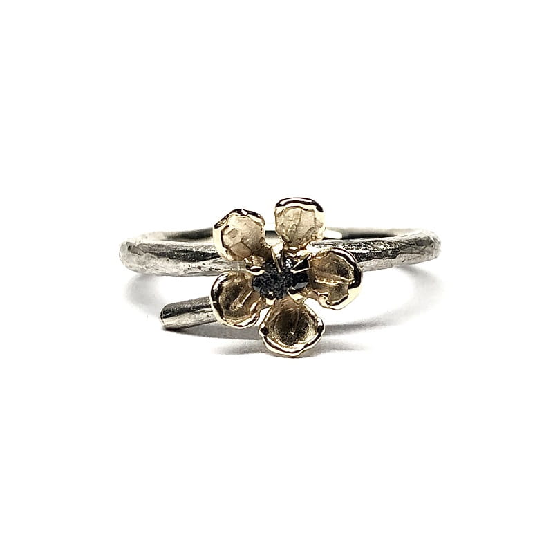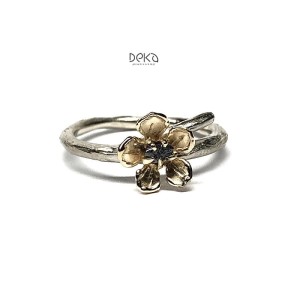 Pierścionek wykonywany ręcznie na zamówienie ze złota pr 0,585, z czarnym, nieoszlifowanym diamentem. Każdy pierścionek jest niepowtarzalny, subtelny, utrzymany w romantycznym stylu. Inspirowany naturą, kwiatem poziomki. Wewnątrz, pomiędzy płatkami oprawiony jest czarny diament. Obrączka pierścionka ma szerokość ok 1,7mm a rozpiętość płatków ok 9,5mm. Czas realizacji zamówienia ok 20 dni roboczych.