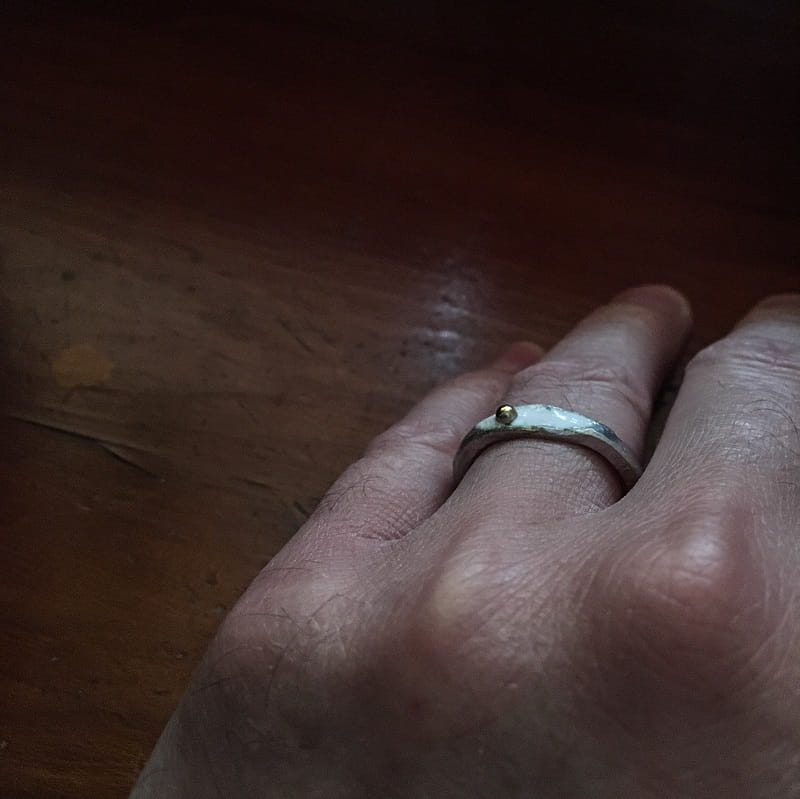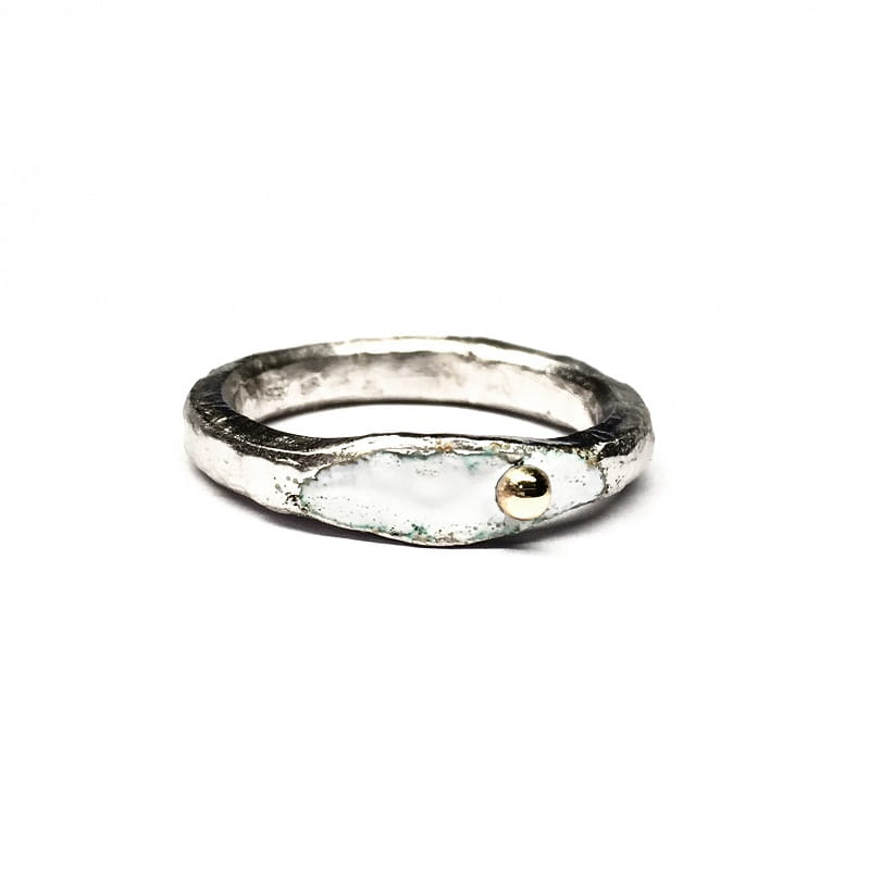 Pierścionek, wykonywany ręcznie ze srebra pr 0,925 z białą ceramiczną emalią i elementem ze złota pr 0,585 (14K). Odważna forma przeznaczona dla indywidualistów i osób poszukujących niebanalnej biżuterii. Powierzchnia obrączki ma nieregularną, plastyczną fakturę , w białej emalii wtopiona jest złota granulka. Rozmiar pierścionka 16. Inne rozmiary wykonywane są na zamówienie. Czas realizacji zamówienia ok 10 -14 dni.