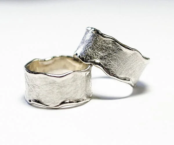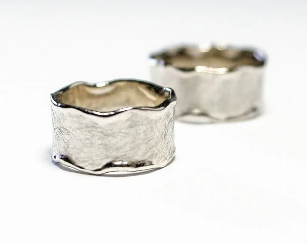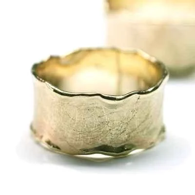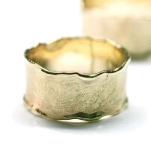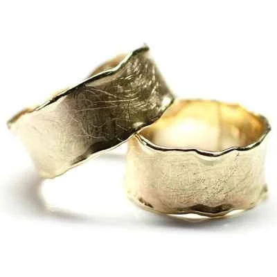 Szerokie obrączki z żółtego lub białego złota pr 0.585 (14K). Wykonywane ręcznie na zamówienie po wcześniejszym ustaleniu rozmiarów. Bardzo efektowne utrzymane w charakterystycznej stylistyce biżuterii antycznej. Środek obrączek jest matowy a boki błyszczące. Szerokość obrączek 10 mm waga ok 10,30g dla rozmiarów 12 i 20.