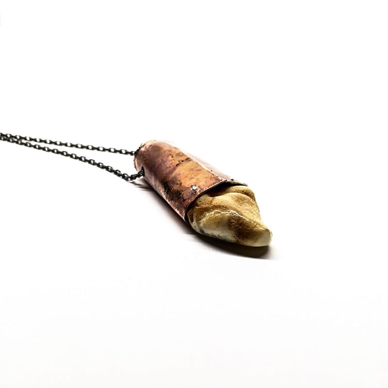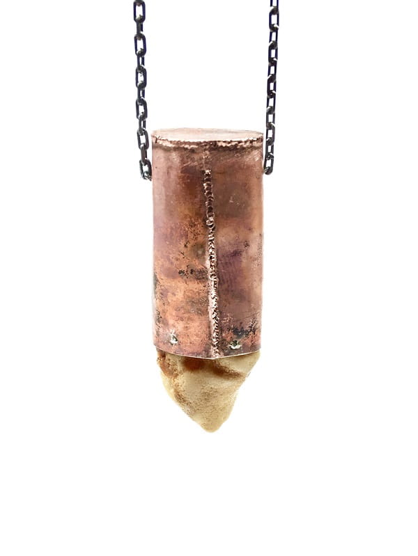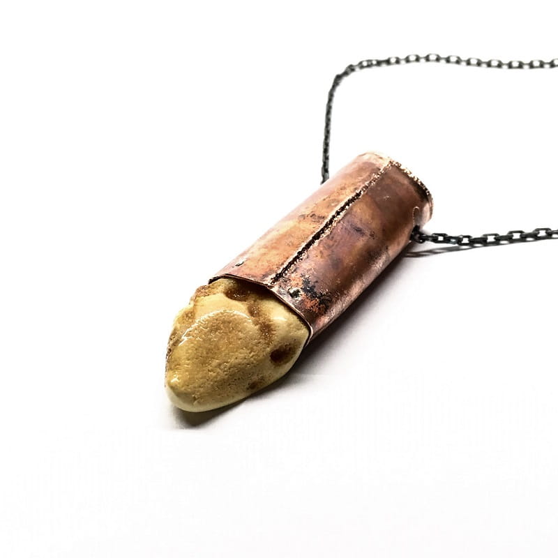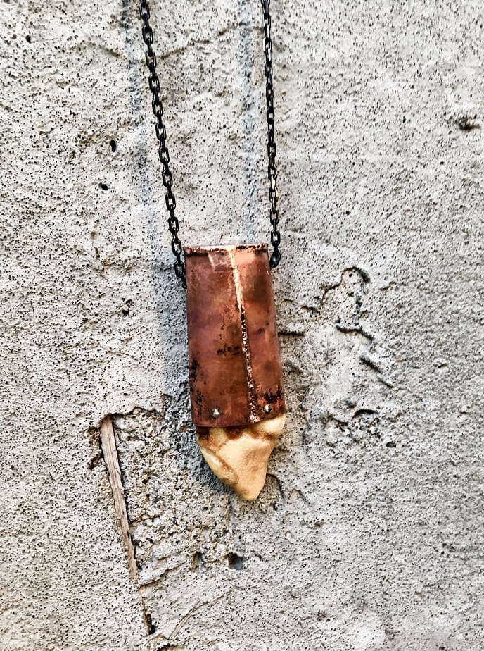 Duży rustykalny wisior wykonany ręcznie z miedzi z bursztynem przynitowanym srebrnymi nitami . Zawieszony na długim łańcuszku z oksydowanego srebra. Bryła zbudowana jest z zespawanych elementów, na krawędziach widoczne są spawane łączenia. Wymiary wisiorka 6cm x 2,2cm.